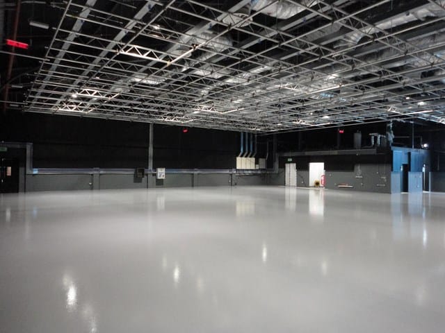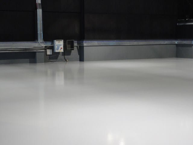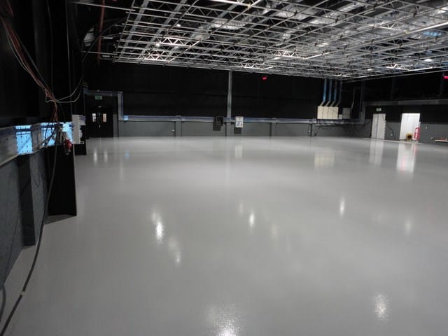 The floor had to be beyond SR1 (SR1 is not sufficient for a studio floor) to ensure that cameras cannot roll from a static position anywhere on the floor. The surface had to be free from any defects which would result in vibration passing from the camera pedestal to the camera as it is tracked across the floor.